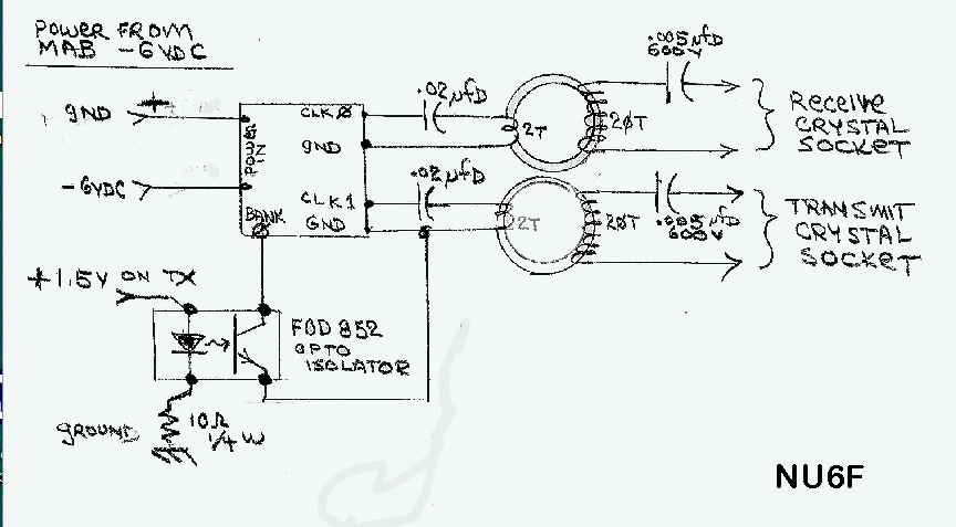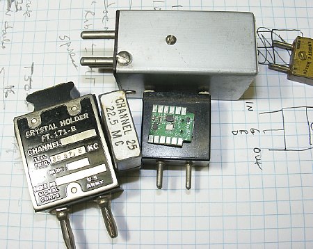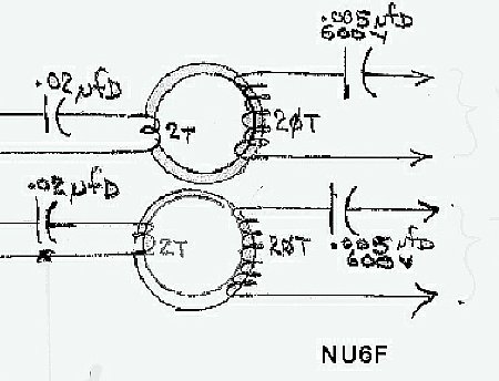 ![]() Ron NU6F used small toroid transformer to increase voltage for crystal socket matching and injection. Full schematic is shown below in "Military" section. |