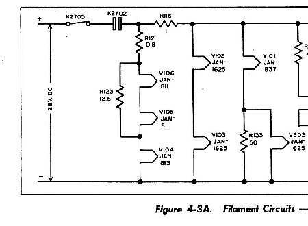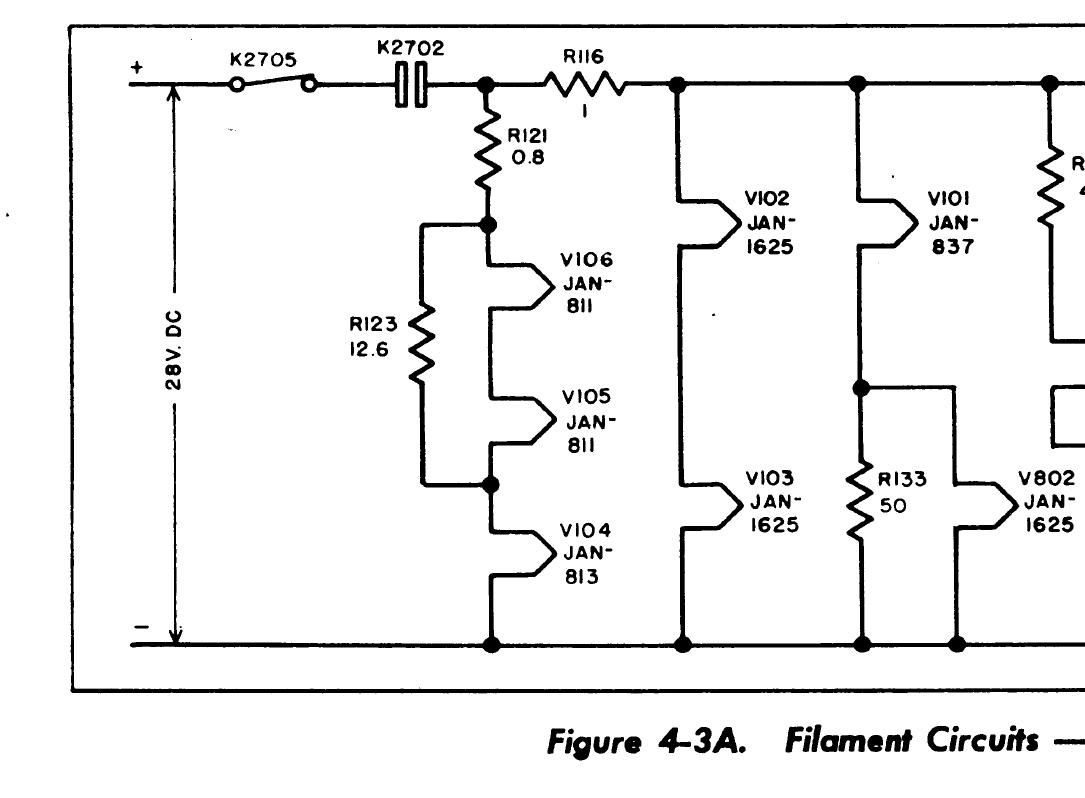 The 811 filaments (rated at 6.3V) are in series with the 813 (10V) filament. The ART-13 supply voltage for best operation is 28 volts input to the Dynamotor. The 28VDC output from the Dynamotor chassis will be slightly lower due to internal wiring of the Dynamotor etc. R121 and 123 (shown above) reduce the 28 volts slightly. Do not remove R121 or R123. You can't just unplug the 811's as the 813 final amplifier filament is in series.