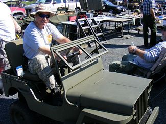 | Jeff trys out a mini jeep knock off. Under the mini jeep chassis made by D&L Bessinger is a riding lawn mower frame and engine. 0 to 15 MPH in 30 seconds. |