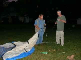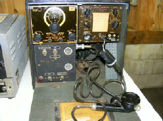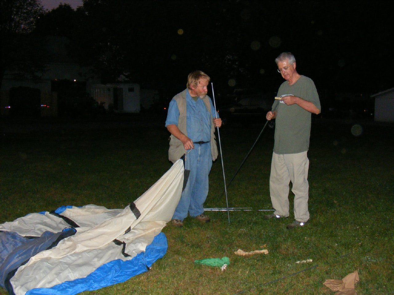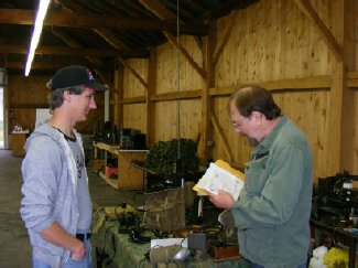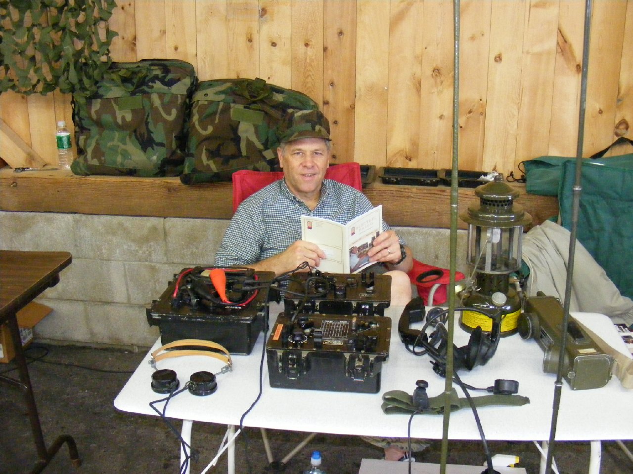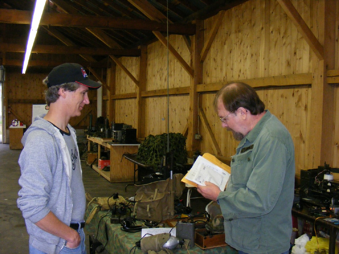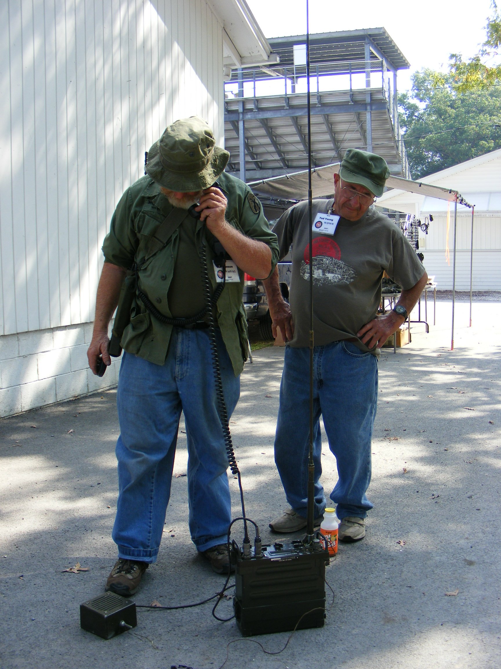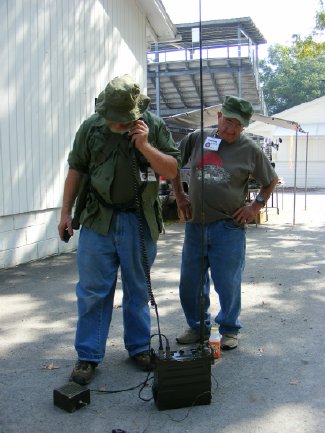 Joe makes a radio check in preparation for the Friday Field Excercise. Ted W3PWW looks on. |